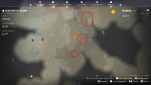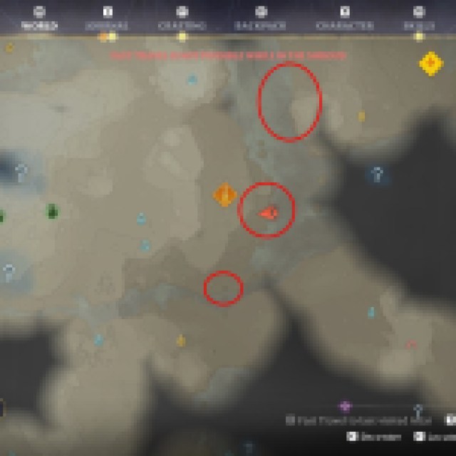 In the image above, you’ll see the Revelwood fast travel spire next to three encircled spots. You want to fast travel to the Revelwood fast travel point and glide down to the shrouded area. Look for an orange hue on the terrain. The color is a lot darker than the clay but has the same orange color. Mining this will give you Amber.