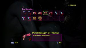 Players can upgrade multiple aspects of their weapons and combat abilities by interacting with T.A.D at different points in the game. This is an NPC with a goat head (I know, not super helpful, but there’s a screenshot below) who will exchange upgrades and items with YOWZAS, which are acquired by selling artifacts to T.A.D as well.